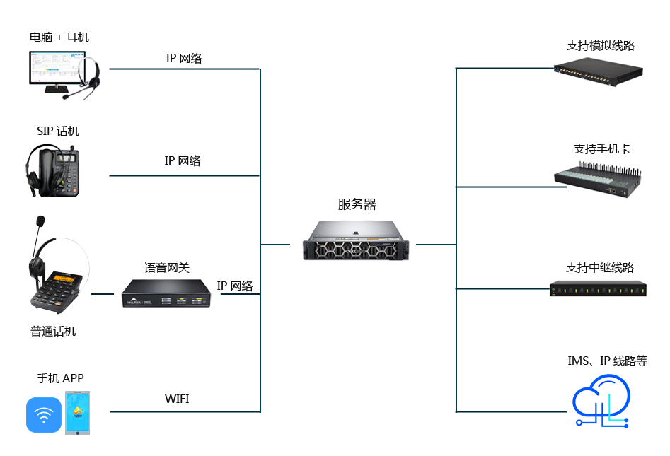 可与座机、手机卡、数字中继线、IMS数字线路、话批线路对接,且支持同时接入